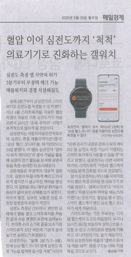 최근 스마트워치를 이용한 건강관리 기능이 속속 추가되고 있습니다. 건강관리 기능을 넘어 이제는 의료기기로 인증을 받는 사례까지도 등장을 하고 있는 것이 사실입니다. 저희가 현재 개발중인 Near Infrared 파장을 이용한 NIR센서 렌즈의 경우가 미국 FDA 승인을 받은 워치 형태의 의료기기에 장착되는 케이스입니다.